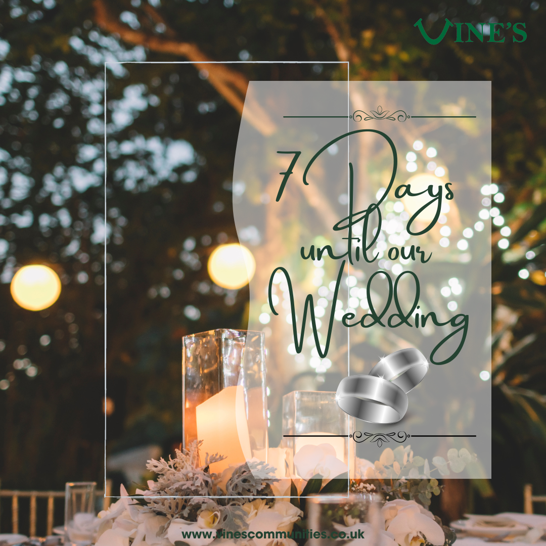 Decorative table setting for an outdoor wedding with candles and flowers, featuring text "7 days until our wedding" and two rings graphic. Website www.vinescommunities.co.uk is displayed.