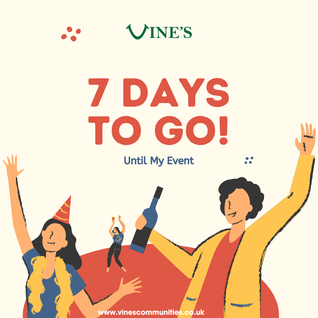 Event countdown poster with two cartoon people celebrating, one holding a bottle and one wearing a party hat. Text reads '7 Days to Go! Until My Event.' Website url vinescommunities.co.uk is at the bottom.